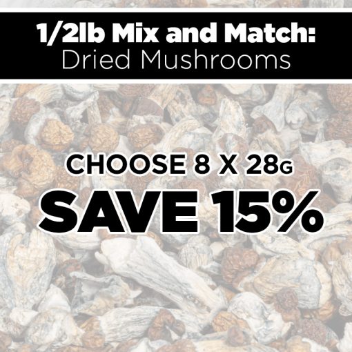 A little variety makes the journey more interesting.. With the Dried Mushrooms 1/2 LB Mix & Match, you get 8 different 28g mushroom varieties for a total of 224 grams. It’s an easy way to explore different experiences without committing to a full 1/2 LB of just one type.