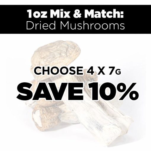 A little variety makes the journey more interesting.. With the Dried Mushrooms 1 OZ Mix & Match, you get 4 different 7g mushroom varieties for a total of 28 grams. It’s an easy way to explore different experiences without committing to a full ounce of just one type.