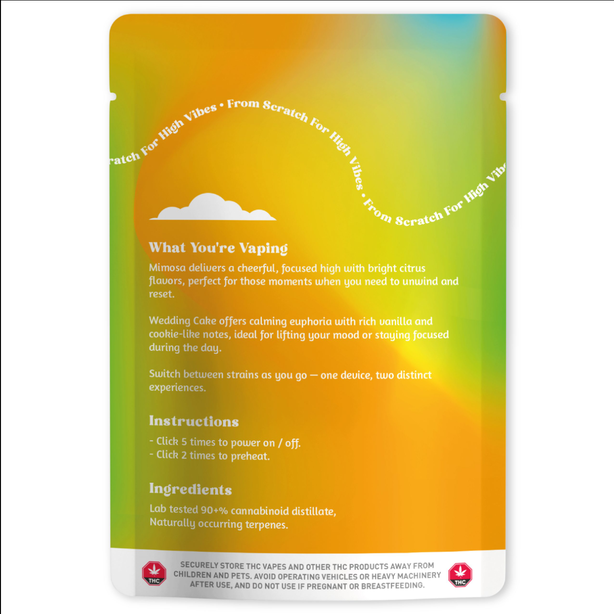 Inside this dual-chamber pen, Mimosa delivers an effervescent hit of tangy orange and clear-headed euphoria. Perfect for mornings or social afternoons. Flip to Wedding Cake for sweet vanilla depth and a balanced hybrid effect that soothes without sedating. Whether you use them solo or blended, the result is pure harmony between mind and body.